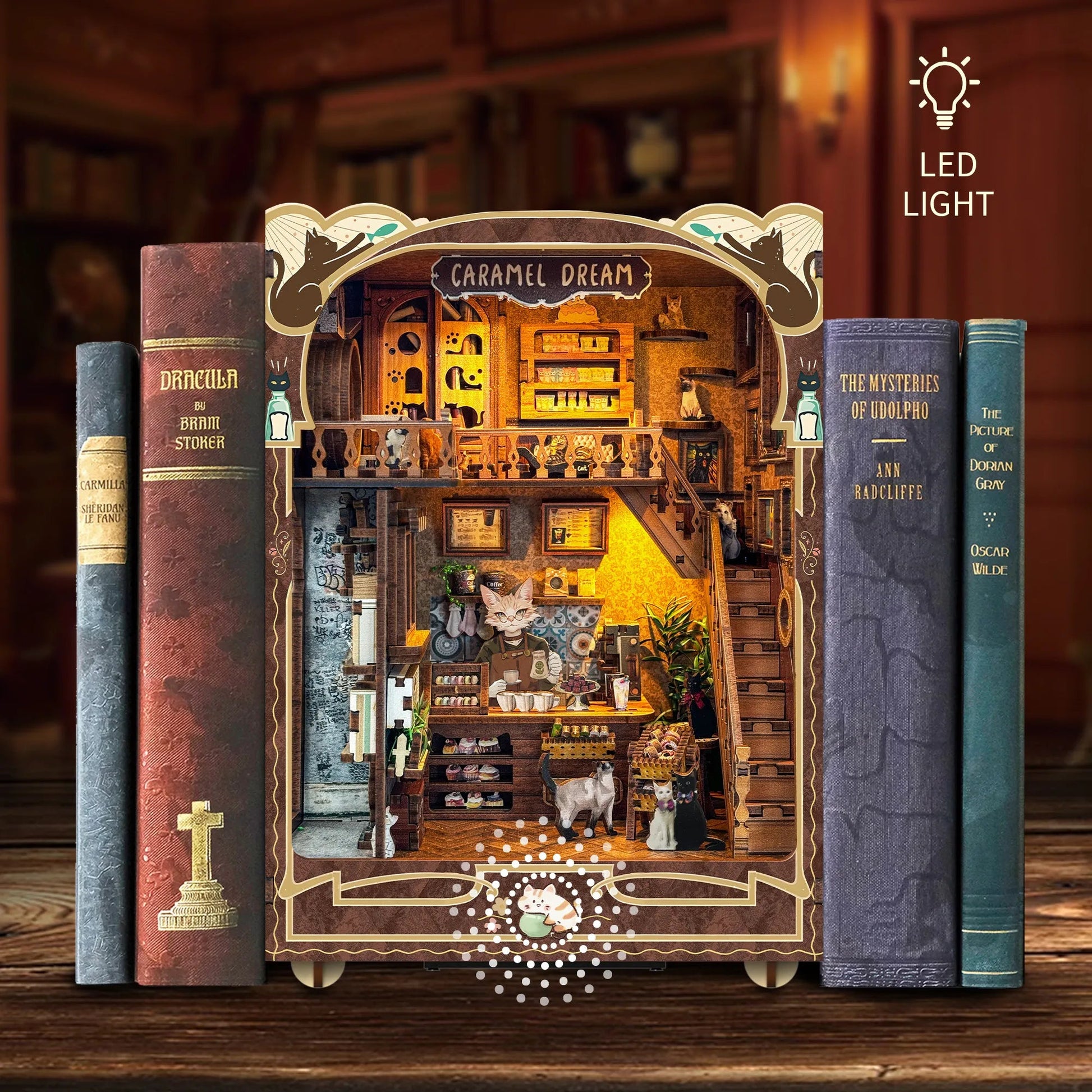 Step into the Caramel Dreams DIY Book Nook Kit a retro cat café brimming with charm. Perfect for cat lovers and DIY fans this miniature blends warm lighting antique vibes and furry friends to create a whimsical bookshelf retreat.